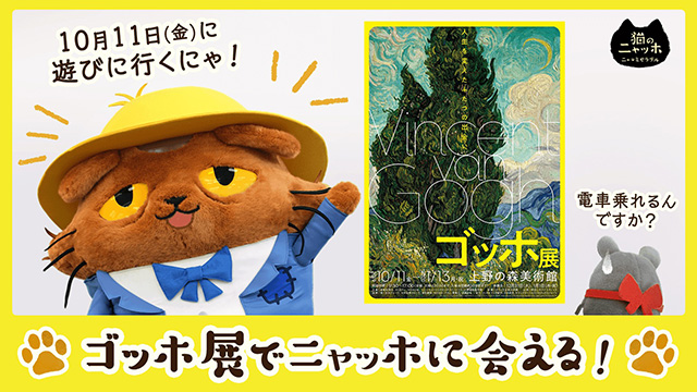 On October 11, 2019, the first day of the exhibition, “Cats Atelier,” the main character of “Cats Atelier,” will be at the Ueno Royal Museum as a cheering supporter and will take pictures with visitors. The event will be held at the Ueno Royal Museum. A photo frame of “Cats Atelier” will be installed on the digital signage “MITENE” at the exhibition site to further enhance the enjoyment of the “Van Gogh Exhibition.