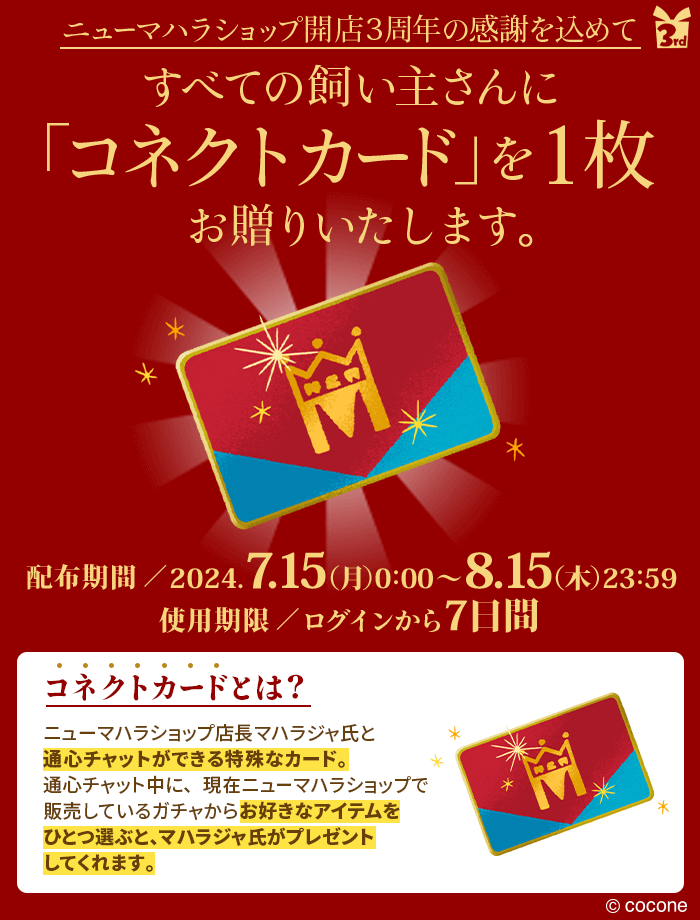 To celebrate the third anniversary of the New Maharaja Shop in the app, all owners who log in during the period will receive one special item, a ” Connect Card. The card will allow you to have a connection chat with Mr. Maharaja, the manager of the New Mahara Shop, and you can choose any one item of your choice, regardless of rarity, from the gachas on sale for free.